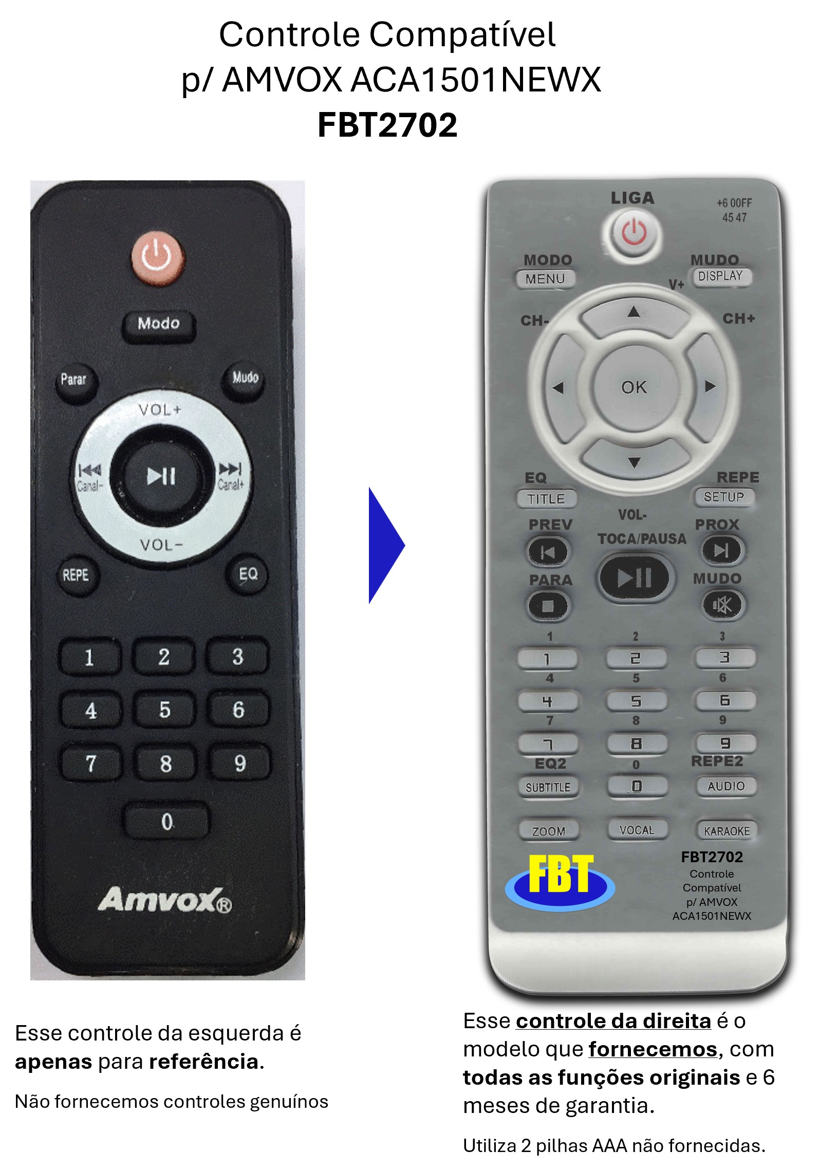 Garantia de seis meses, e reposição permanente. Nós o fabricamos. Se não achou o teu em nossos anúncios, e ainda tem o original defeituoso, nos contate pelo zap 11 98428 5221 ou pelo email fbtControleremoto@gmail.com, e combinamos a compatibilização do teu Controle.