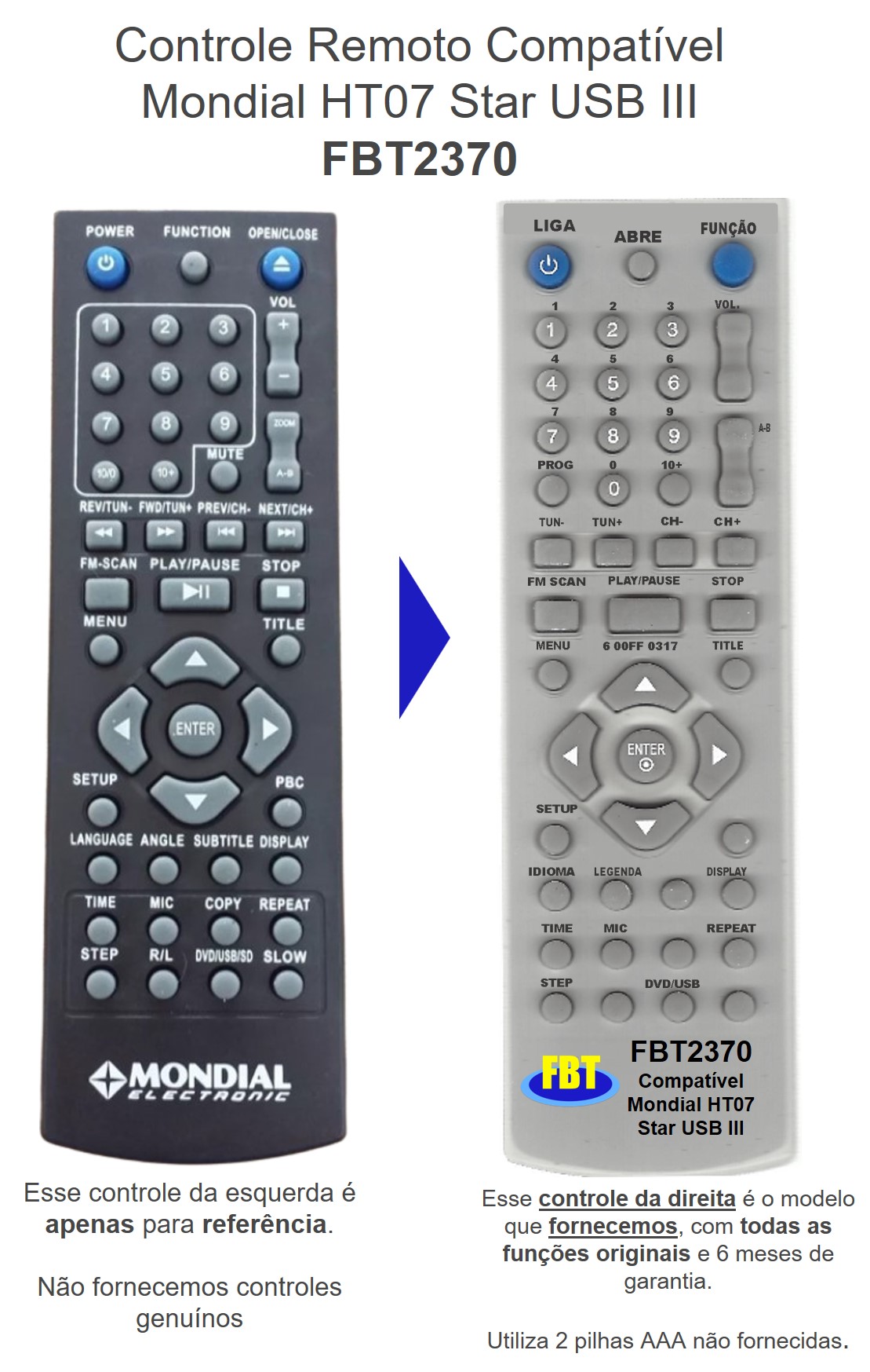 Controle Compatível Com MONDIAL STAR USB III HT07 FBT2370