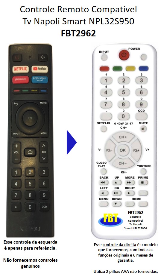 Controle Compatível Com SMART TV NAPOLI NPL32S950 FBT2962