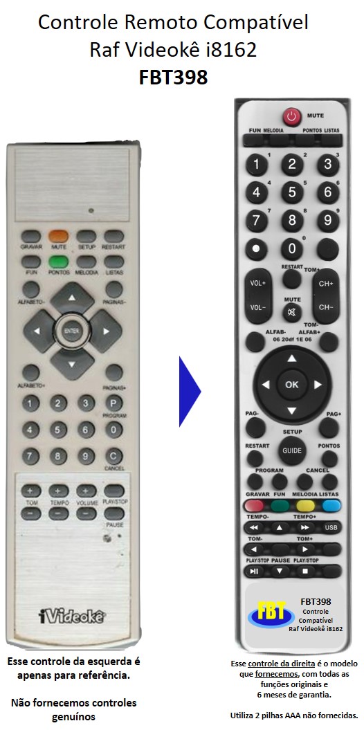 Controle Remoto Compatível RAF Videokê Vmp I-Videokê MINI 8162 I-2000 FUN POP200 FBT398
