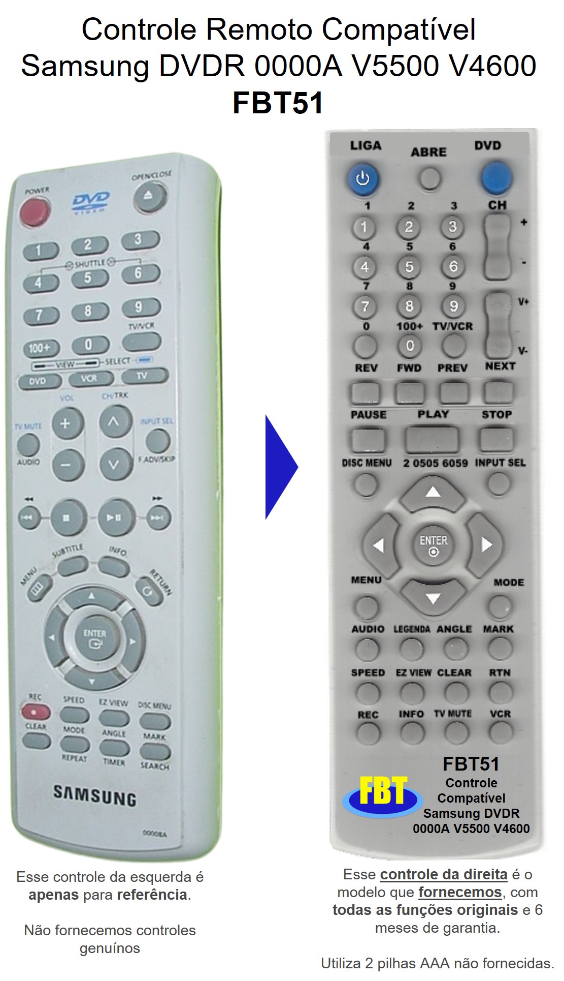 Controle Compatível Samsung Dvd Vcr Grav V5500 00008a Fbt51