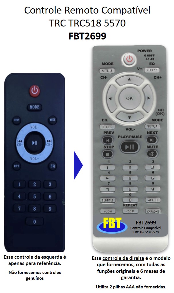 Garantia de seis meses, e reposição permanente. Nós o fabricamos. Se não achou o teu em nossos anúncios, e ainda tem o original defeituoso, nos contate pelo zap 11 98428 5221 ou pelo email fbtControleremoto@gmail.com, e combinamos a compatibilização do teu Controle.