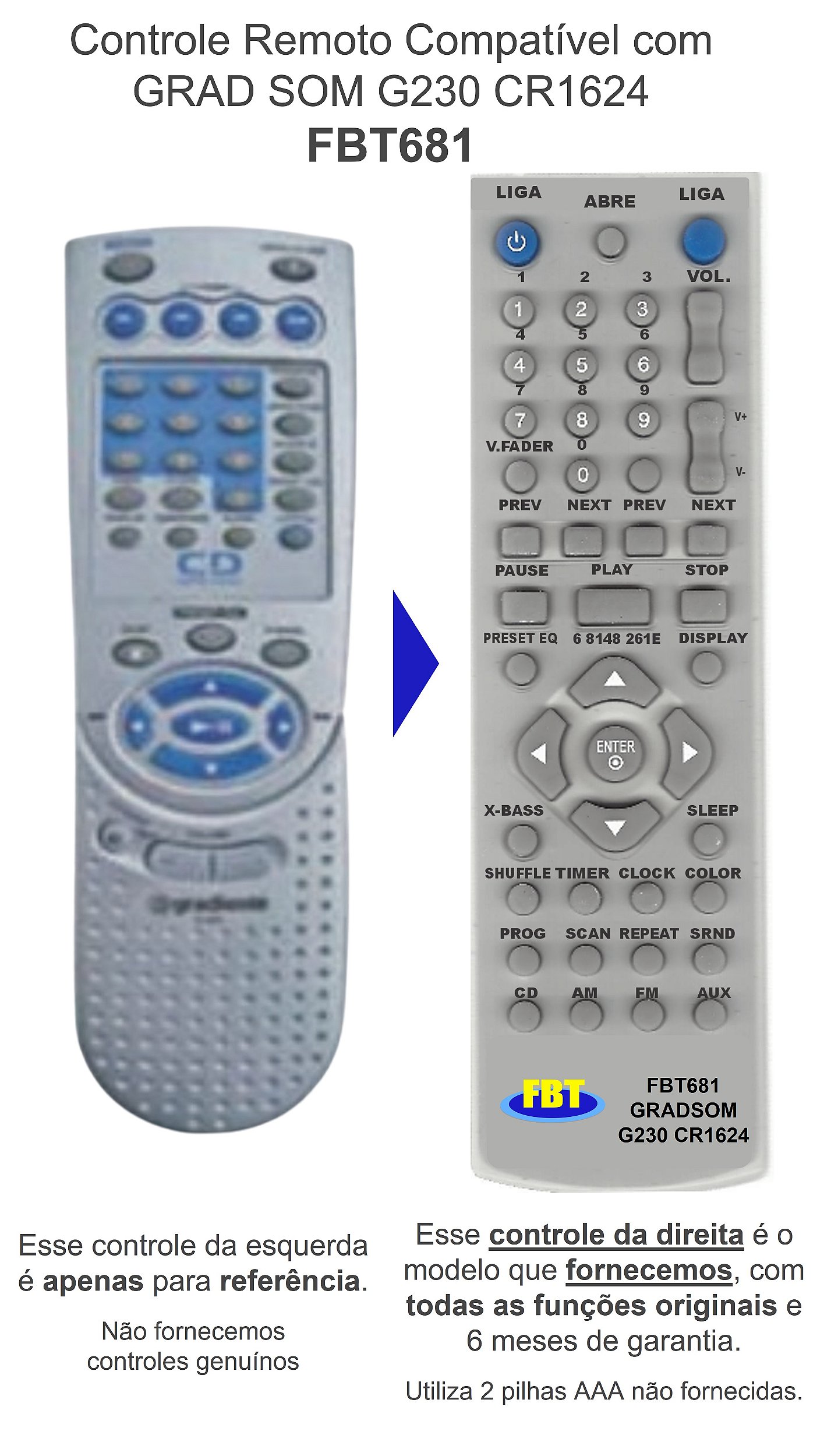 Controle Remoto Compatível com GRAD SOM G230 CR1624 FBT681