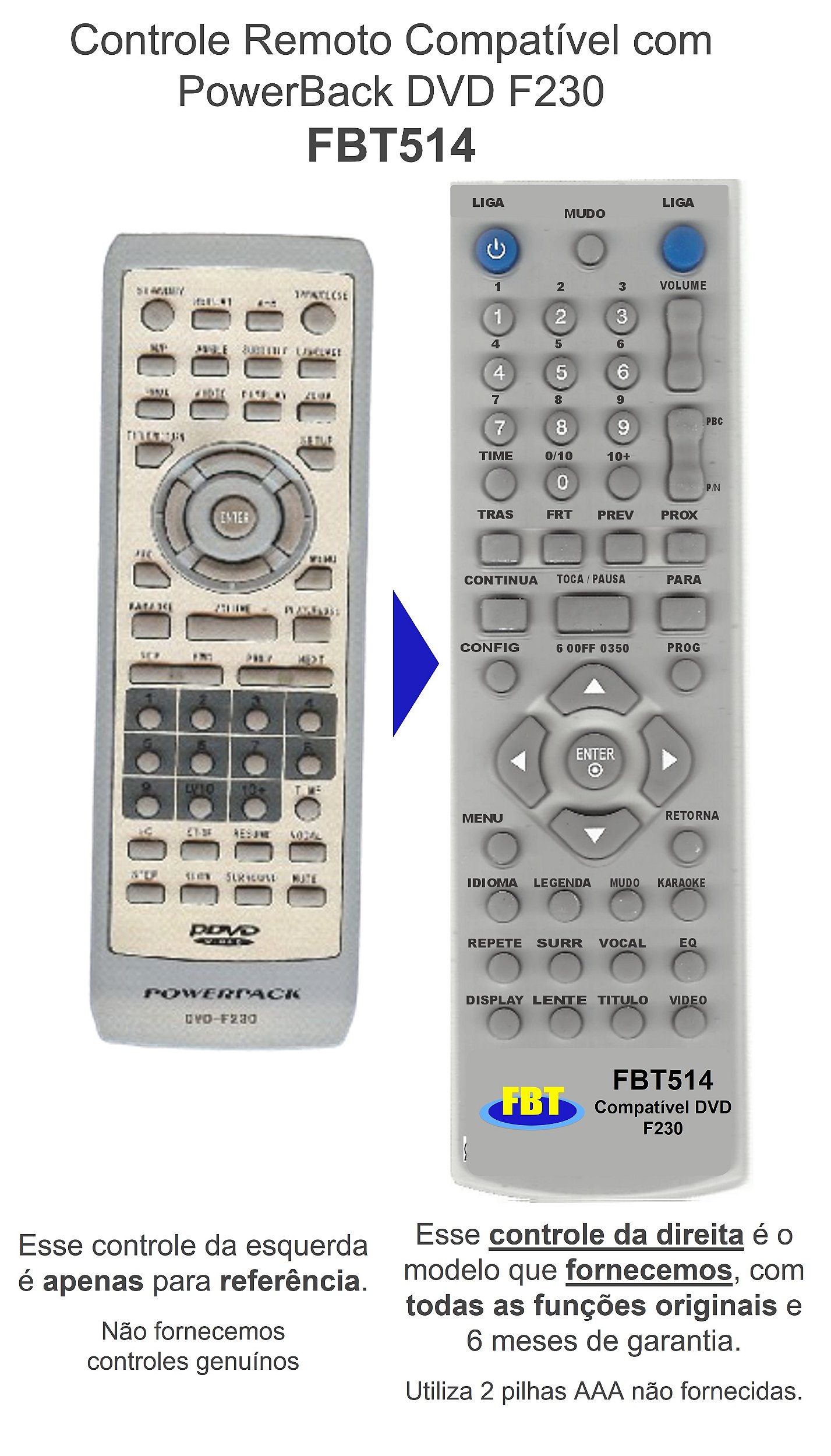 Controle Remoto Compatível com PowerBack DVD F230 FBT514