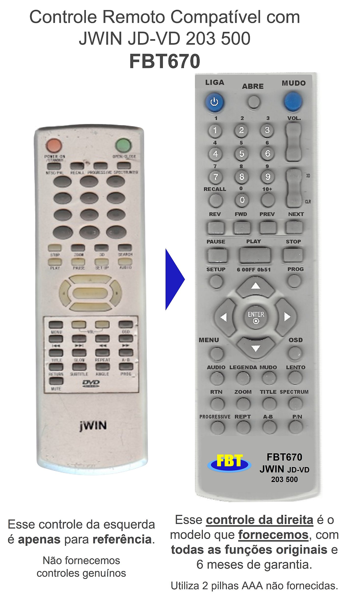Controle Remoto Compatível com JWIN JD-VD 203 500 FBT670