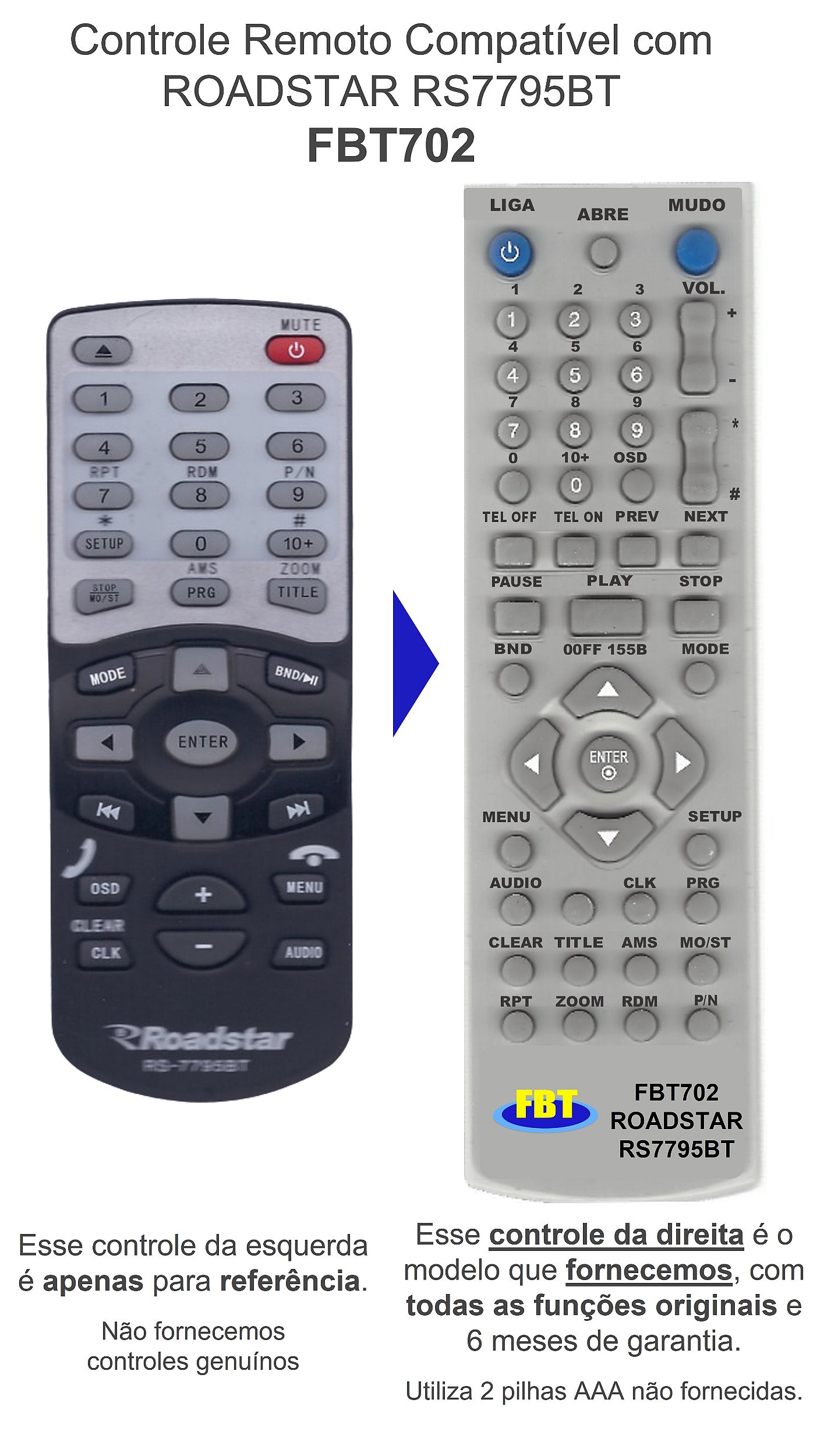 Controle Remoto Compatível com ROADSTAR RS7795BT FBT702