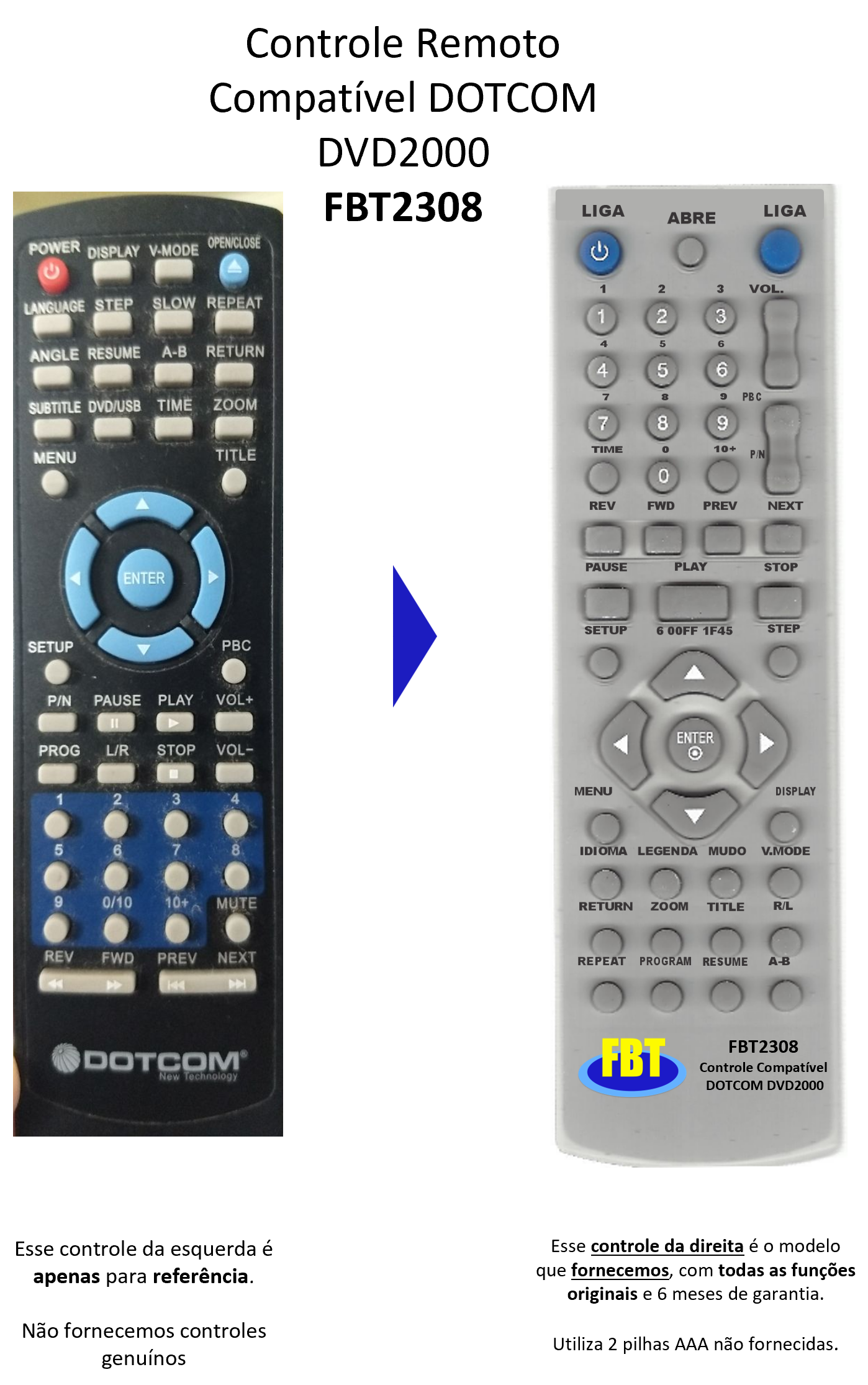 Controle Remoto Compatível DOTCOM DVD2000 FBT2308