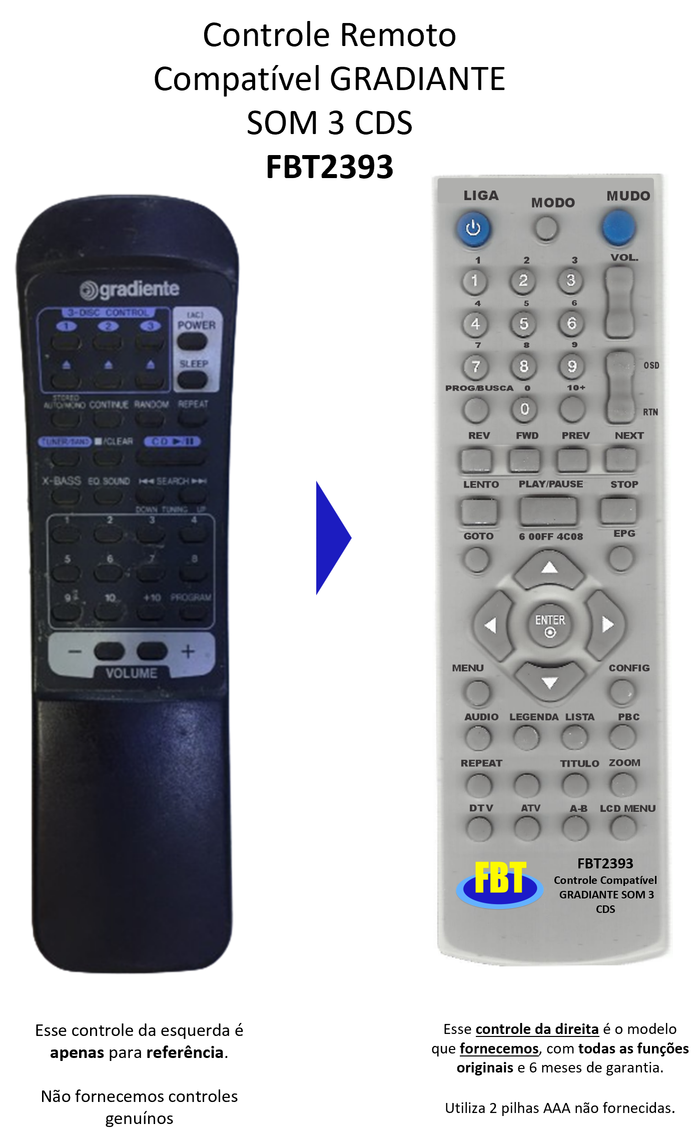 Controle Remoto Compatível GRADIANTE SOM 3 CDS FBT2393