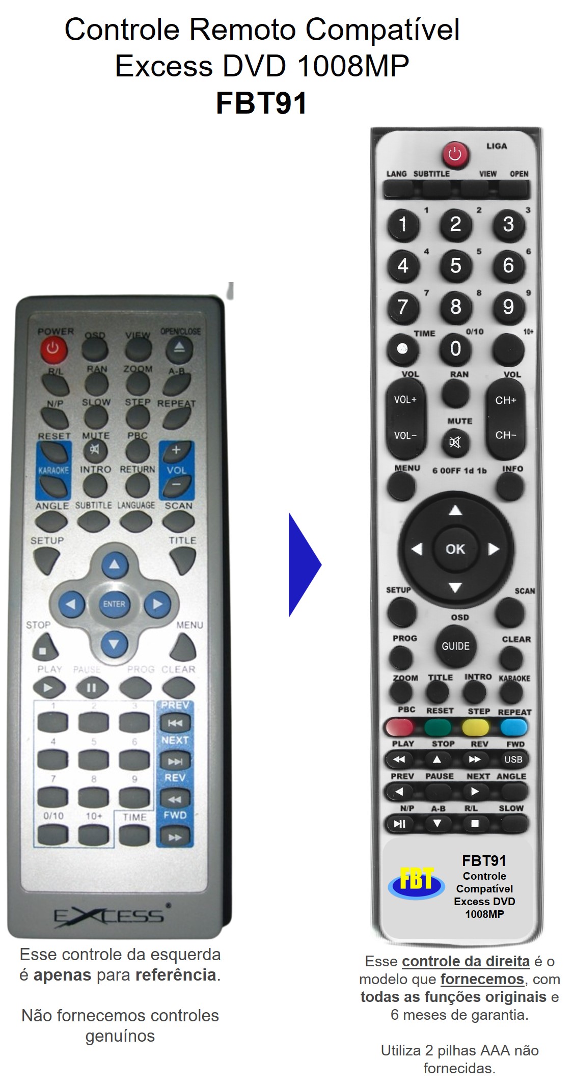 Controle Remoto Compatível p/ Excess EDVD 1008MP FBT91