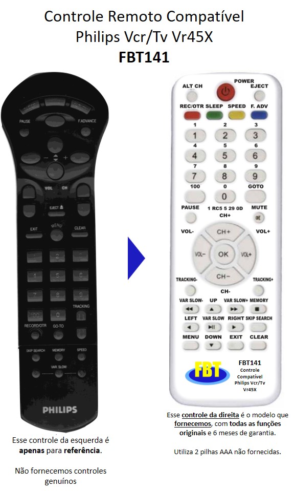 Controle Remoto Compatível p/ Philips VCRTV FBT141