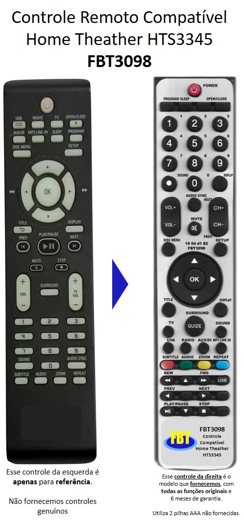 Controle Remoto Compatível Philips Home HTS3345 FBT3098
