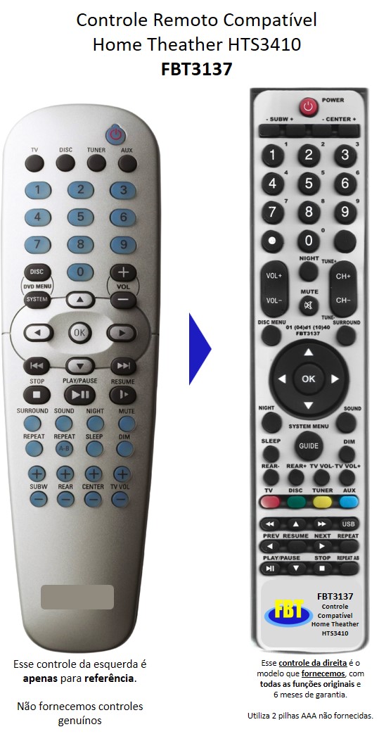 Controle Remoto Compatível Philips Home HTS3410D/BK FBT3137