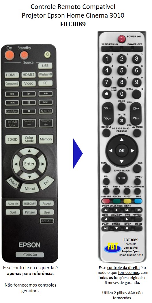 Controle Remoto Compatível Projetor Epson Home Cinema 3010 FBT3089