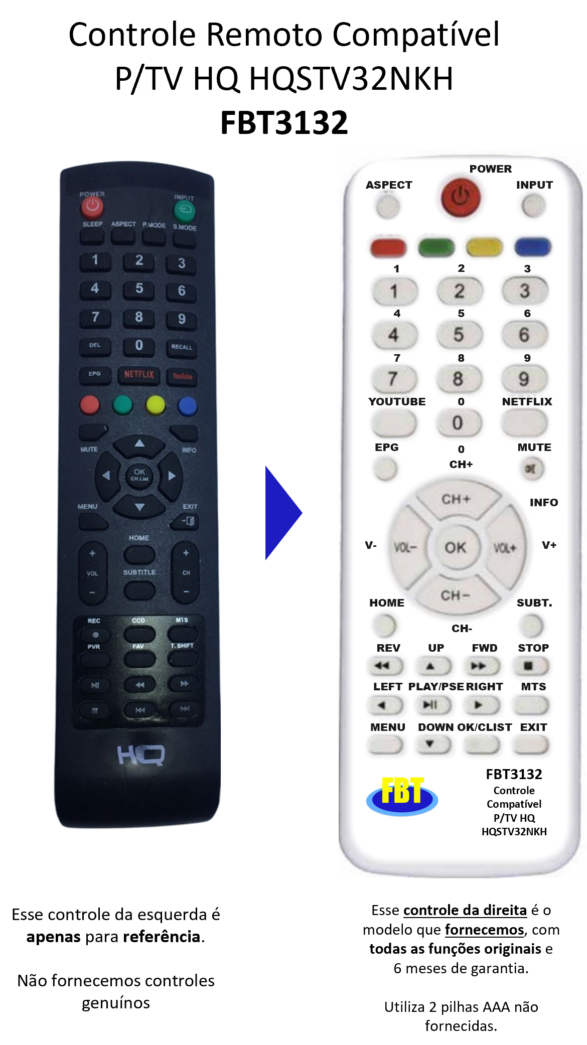 Controle Remoto Compatível P/TV HQ HQSTV32NKH FBT3132