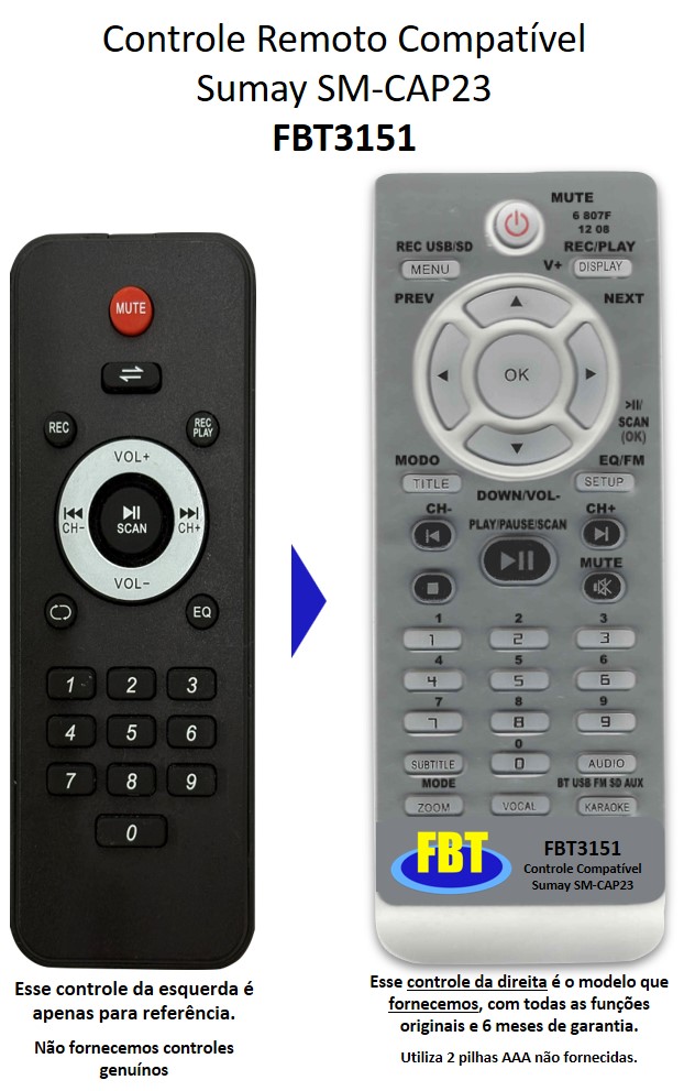 Controle Remoto Compatível Sumay Sm-Cap23 FBT3151