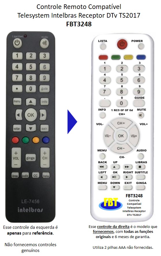 Controle Remoto Compatível Telesystem Intelbras Receptor DTv TS2017 FBT3248
