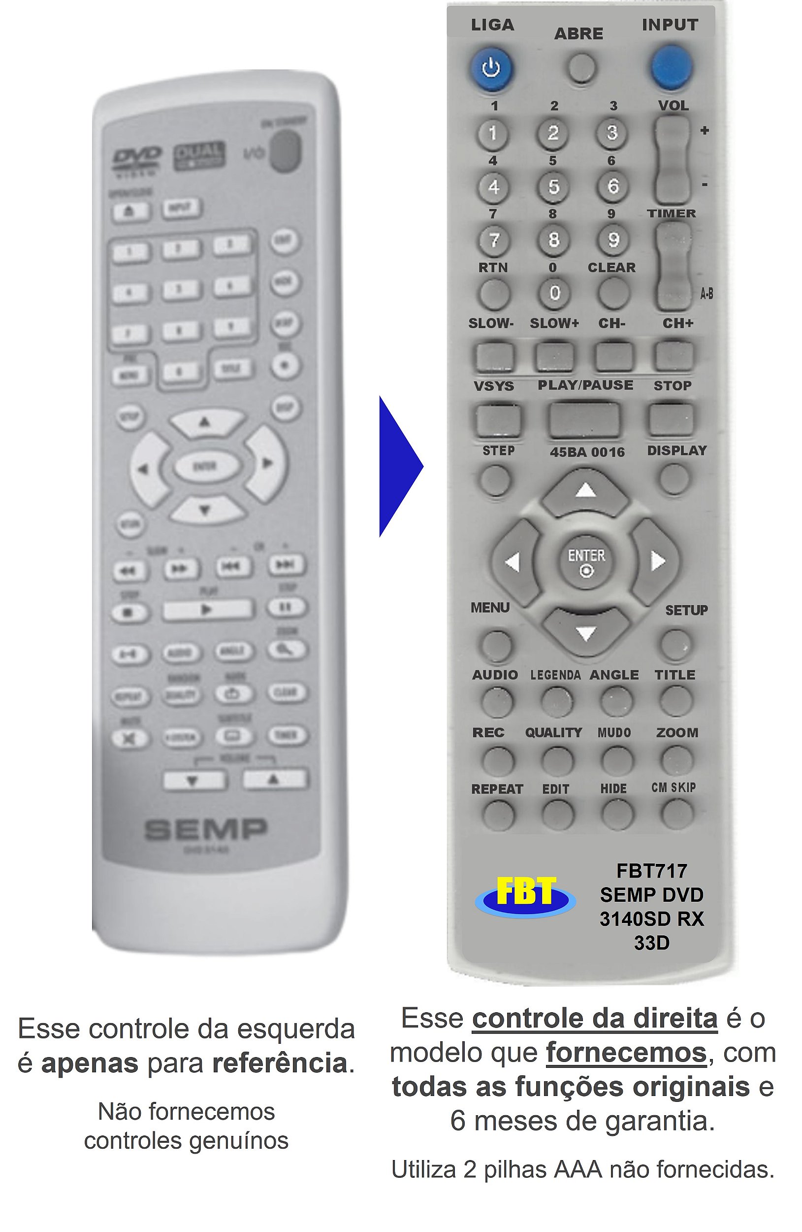 Controle Remoto Compatível com SEMP DVD 3140SD RX 33D FBT717
